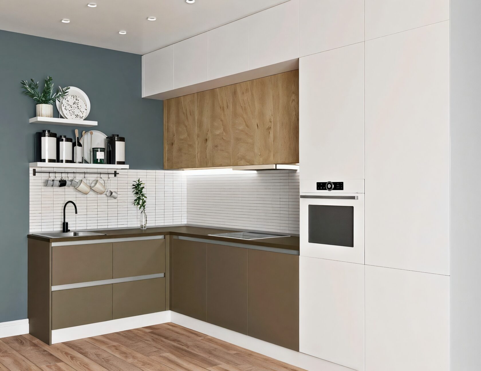 МАТЕРИАЛЫ Фасады: ЛДСП Nordeco более 180 различных цветов и фактур Выдвижные ящики: скрытые направляющие с доводчиками Петли : с доводчиками Корпус : эконом Столешница: Скиф 26мм, влагостойкая ДСП покрытая HPL пластиком