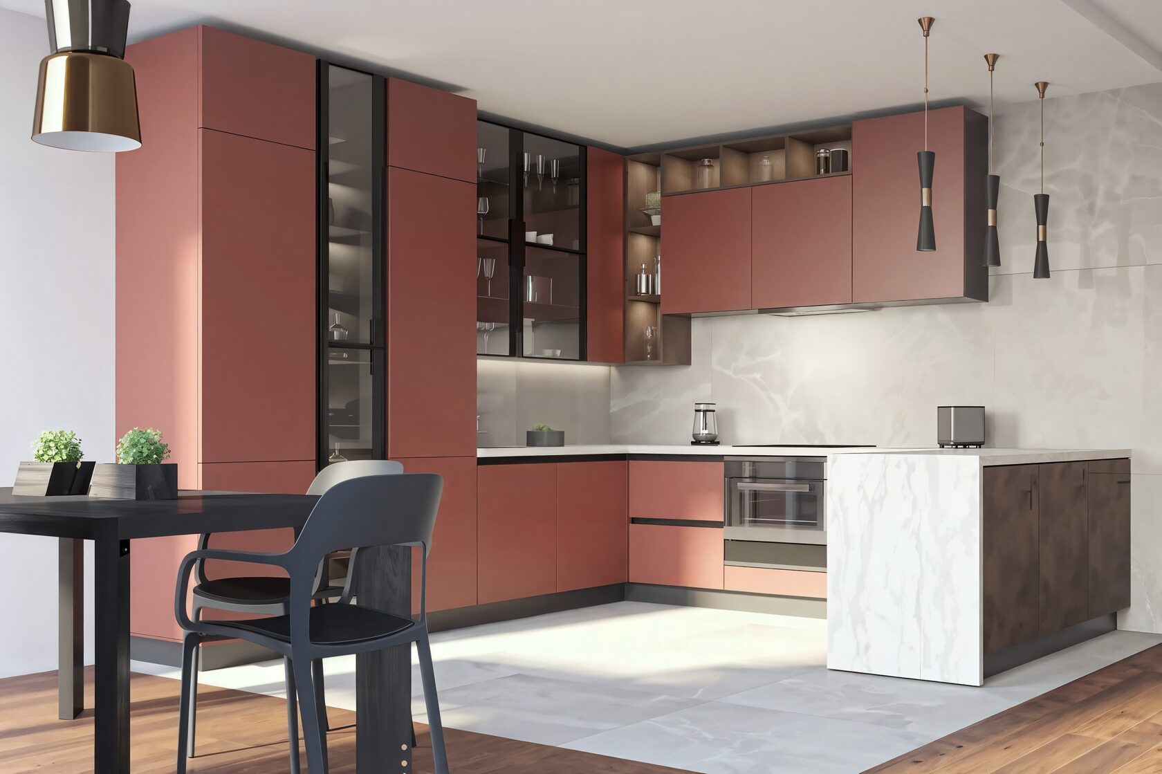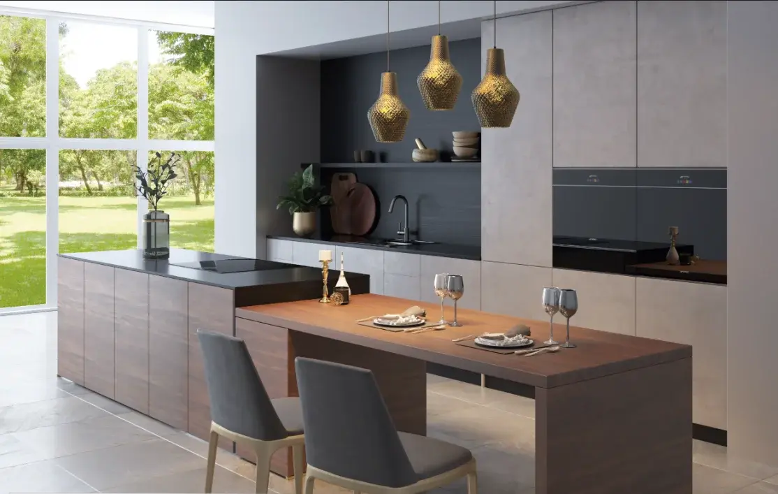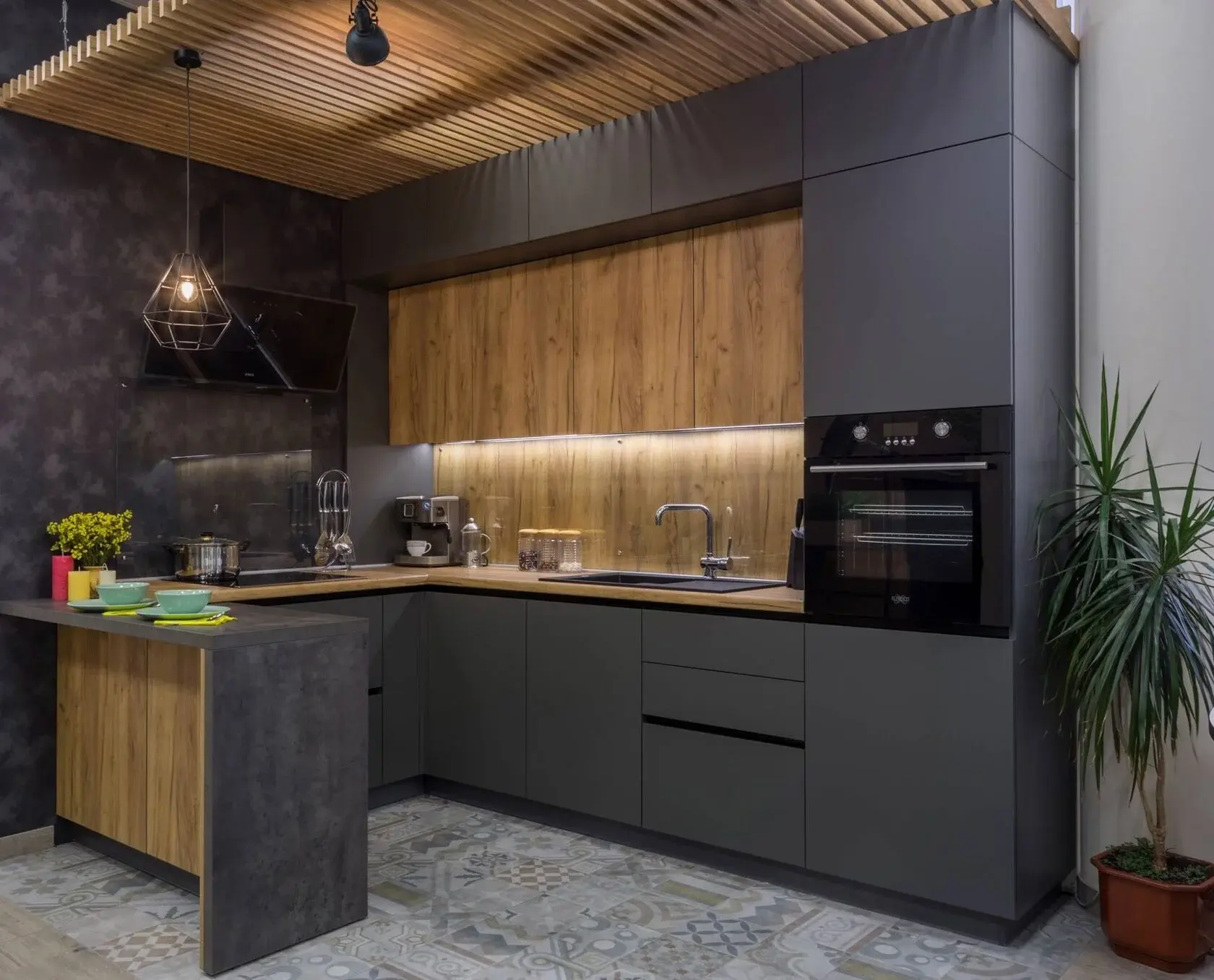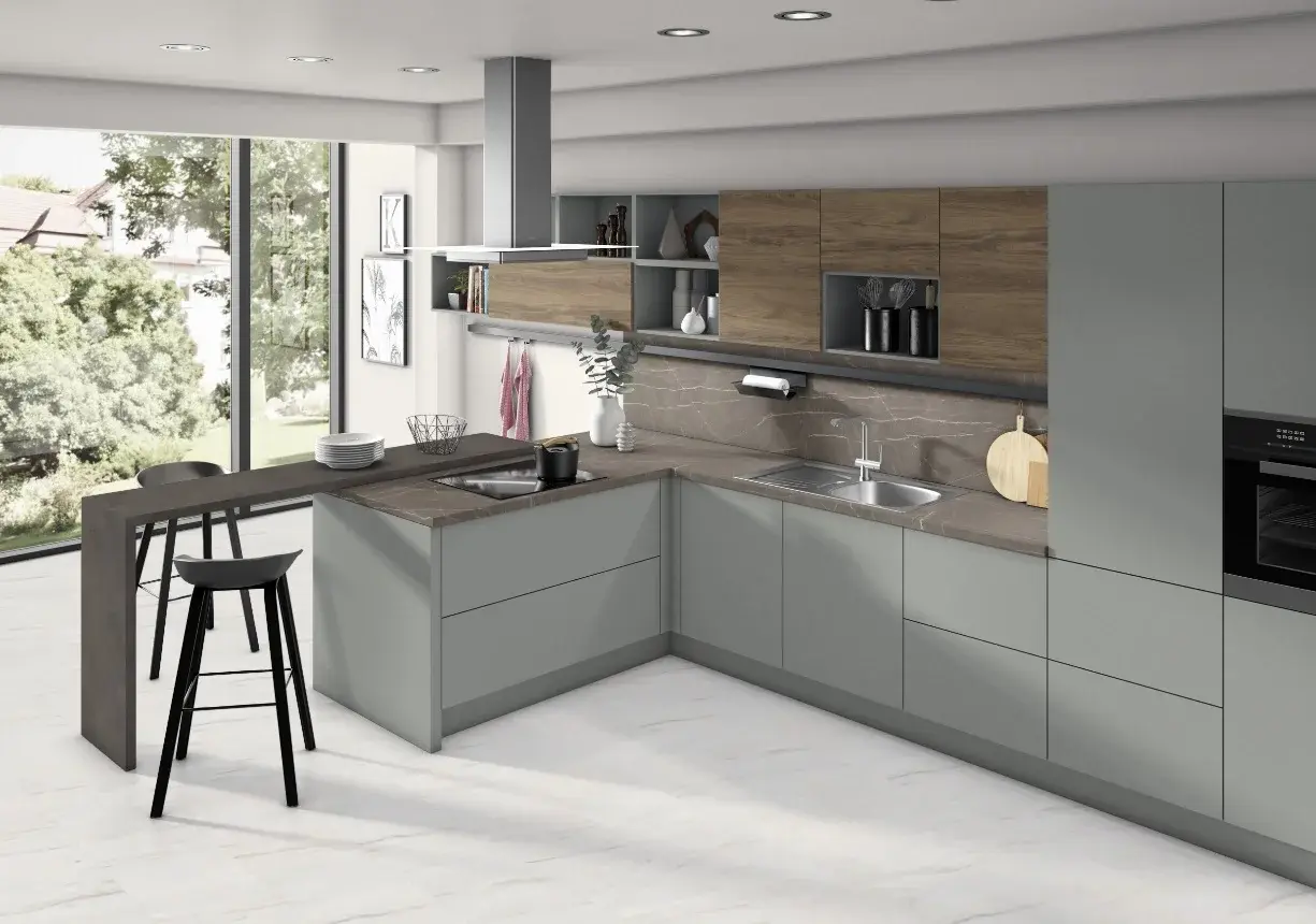 МАТЕРИАЛЫ Фасады: пластик AGT и ЛДСП Еггер более 200 различных цветов и фактур Выдвижные ящики: скрытые направляющие с доводчиками Петли : с доводчиками Корпус : с ручкой Гола Столешница: Slotex, влагостойкая ДСП покрытая HPL пластиком, обратная сторона пластик, предотвращающий разбухание столешницы
